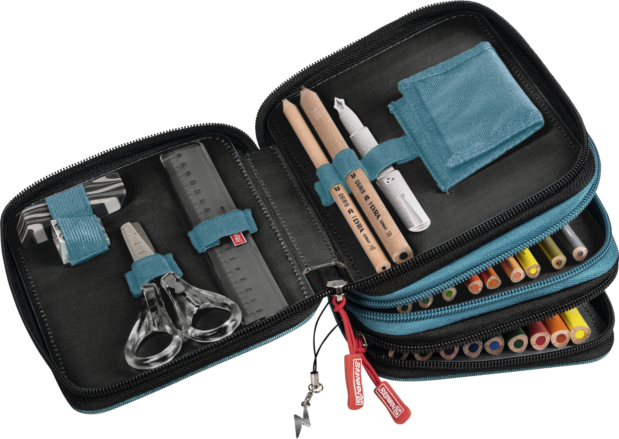 Decorat cu suspensii, 18 creioane colorate subțiri,  9 creioane colorate groase, 2 creioane simple, riglă 16 сm, ascuţitoare metalică dublă, radieră, foarfece, compartiment pentru bani.